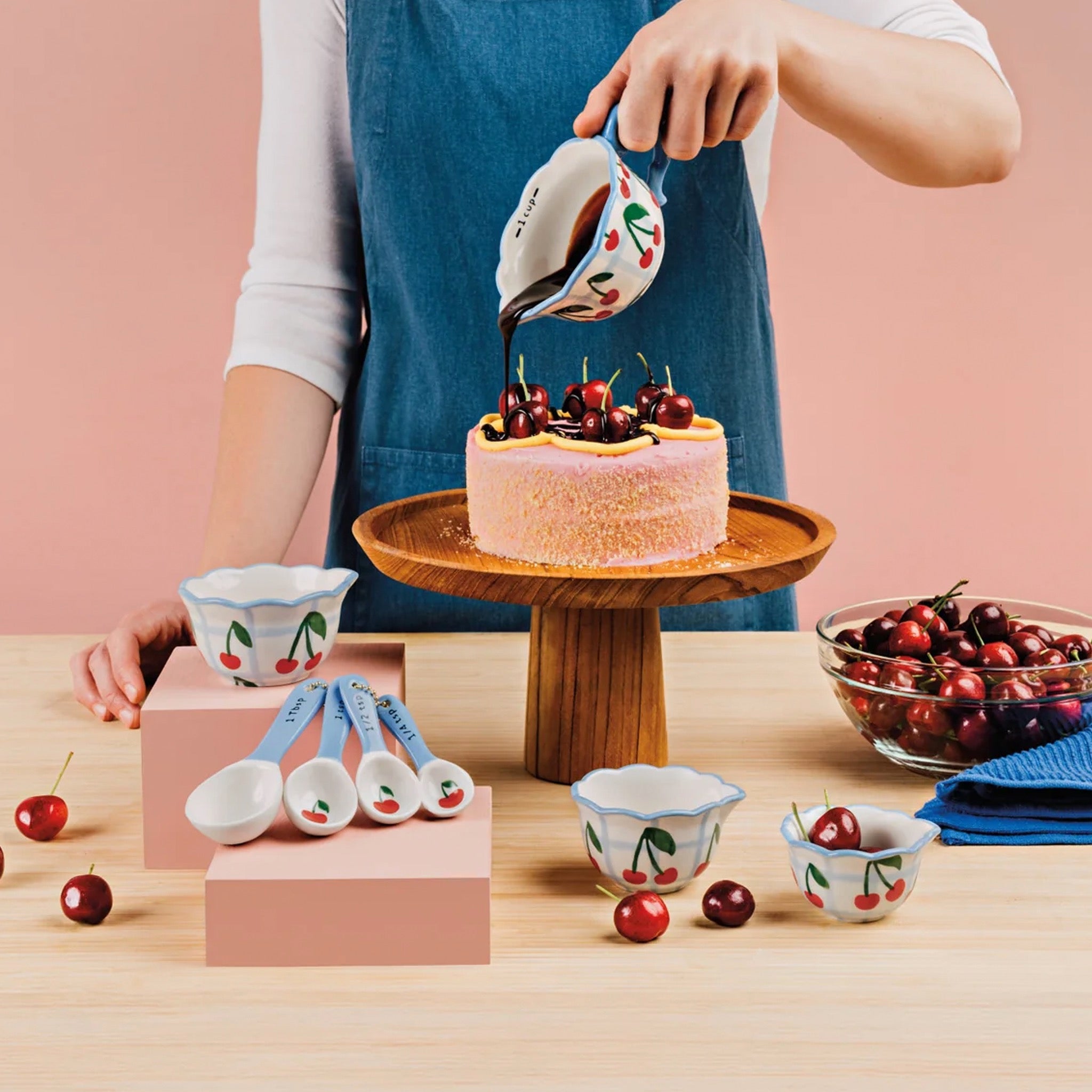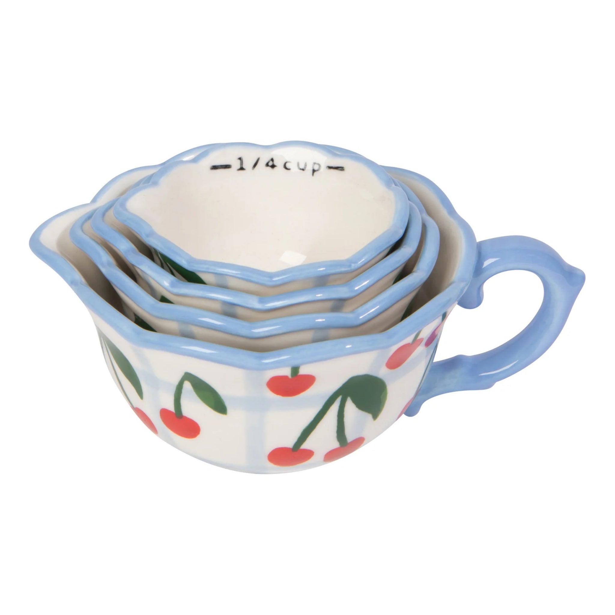 Sweeten baking time with this Very Cherry measuring cups set, featuring teacup inspired shapes, scalloped rims, and hand painted details. Bright cherries and retro color pops add playful charm to everyday measuring.