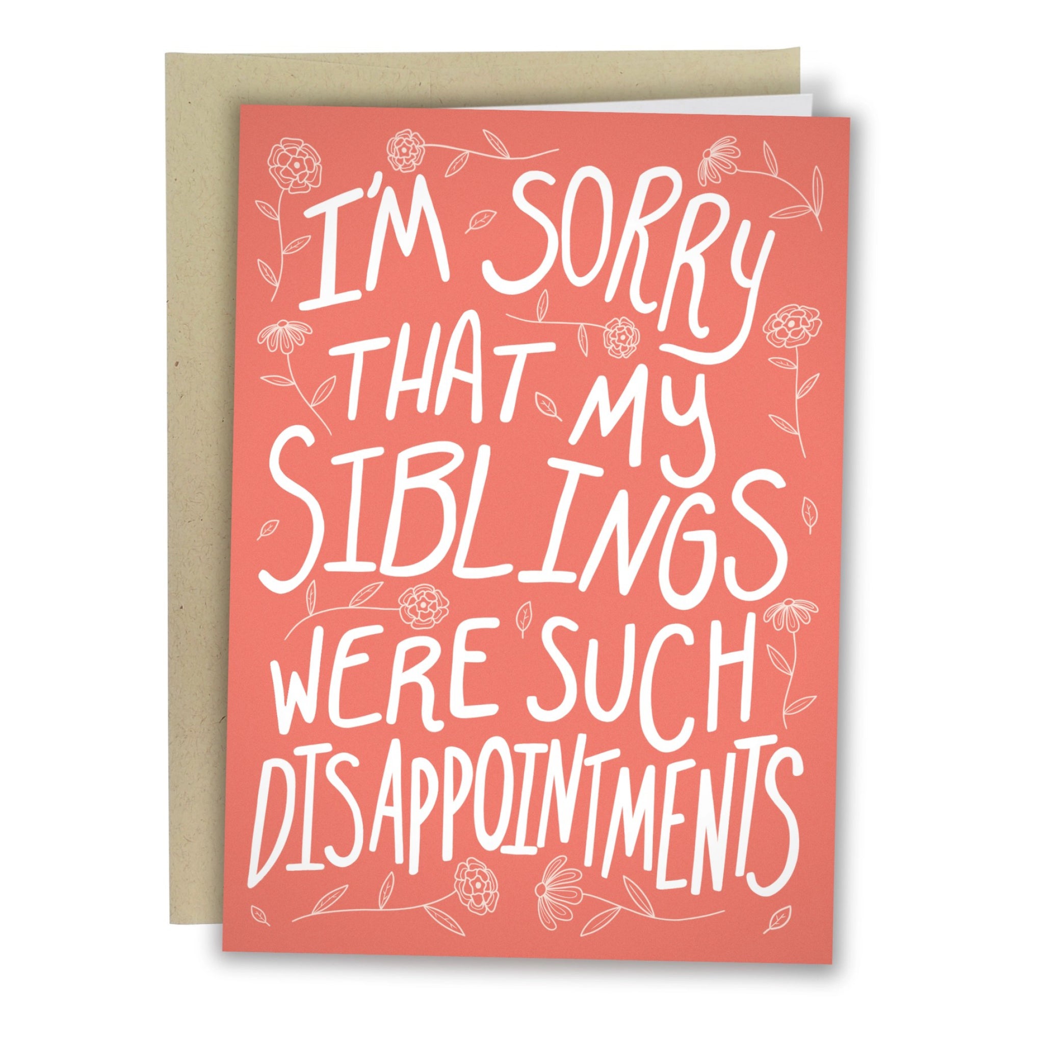 A bold, funny card for moms who appreciate a little sass, featuring the message āIām sorry that my siblings were such disappointments.ā Blank inside so you can make it sweet, sharp, or both.