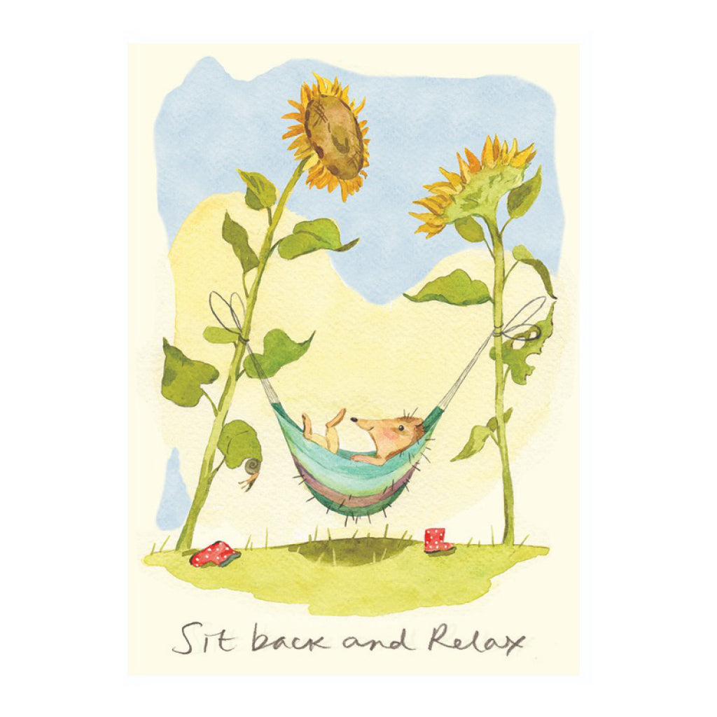 This sweet card features a hedgehog lounging in a hammock strung between two sunflowers with the message “Sit back and relax.” A lovely way to send calm vibes for birthdays, get well wishes, or just because.