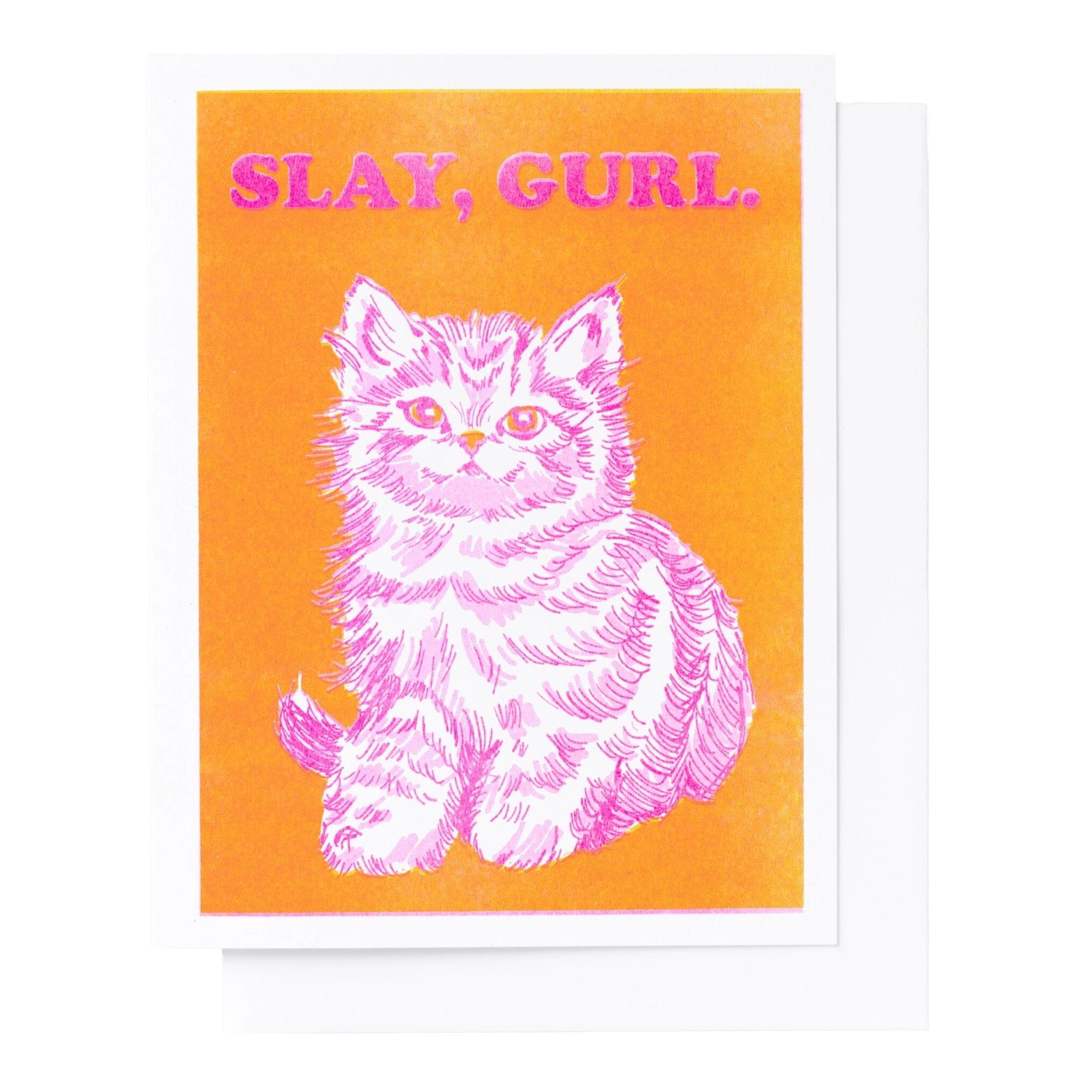Bold risograph card featuring a neon pink kitten and major slay energy. A playful card for congratulations, encouragement, or cheering someone on.