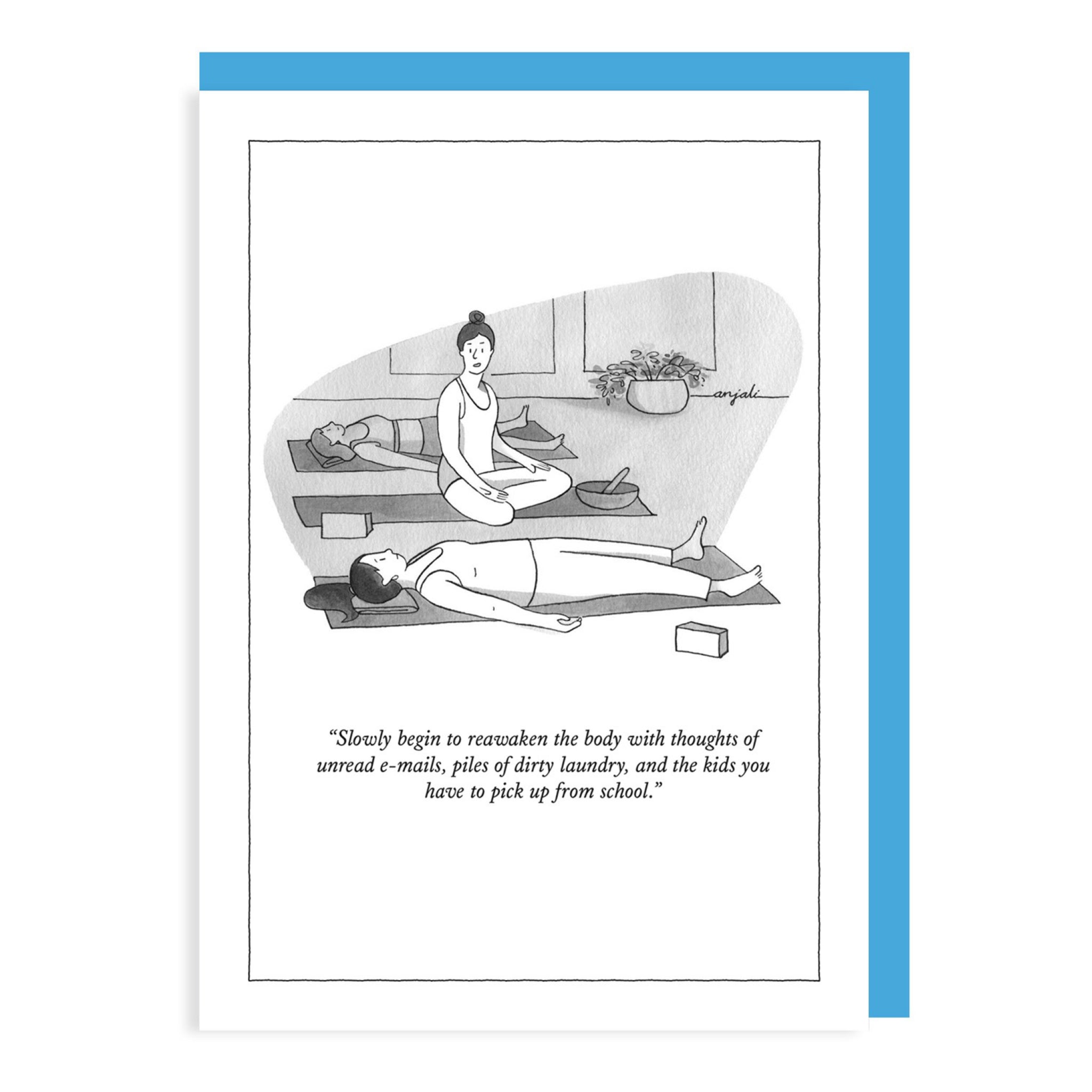 This relatable New Yorker cartoon card captures a yoga class moment with the caption “Slowly begin to reawaken the body with thoughts of unread e-mails, piles of dirty laundry, and the kids you have to pick up from school.” A perfect pick for busy parents and multitaskers.