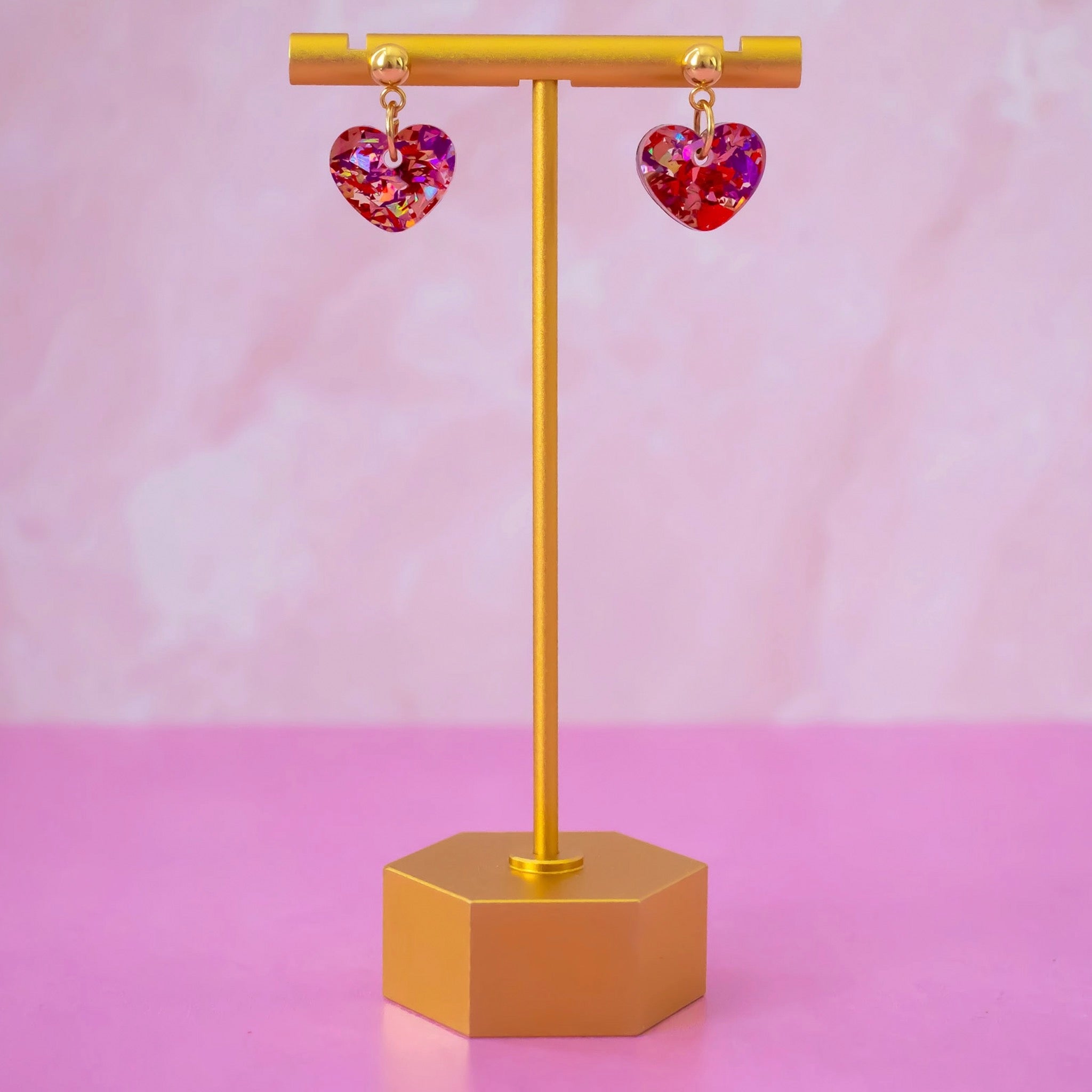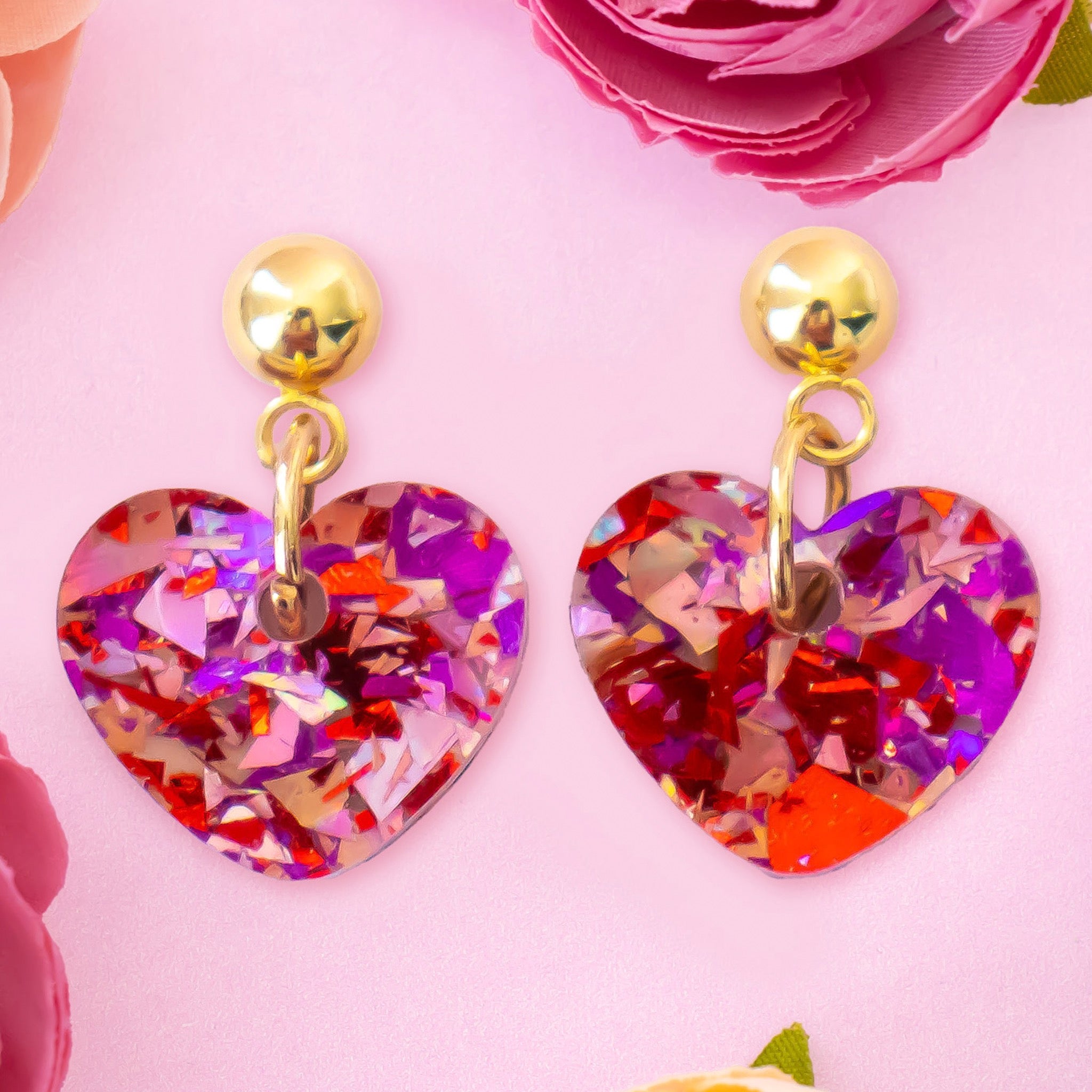 Small but full of sparkle. These confetti heart earrings shine with colourful glitter flakes and a glossy finish, adding a sweet pop that feels light and easy to wear.