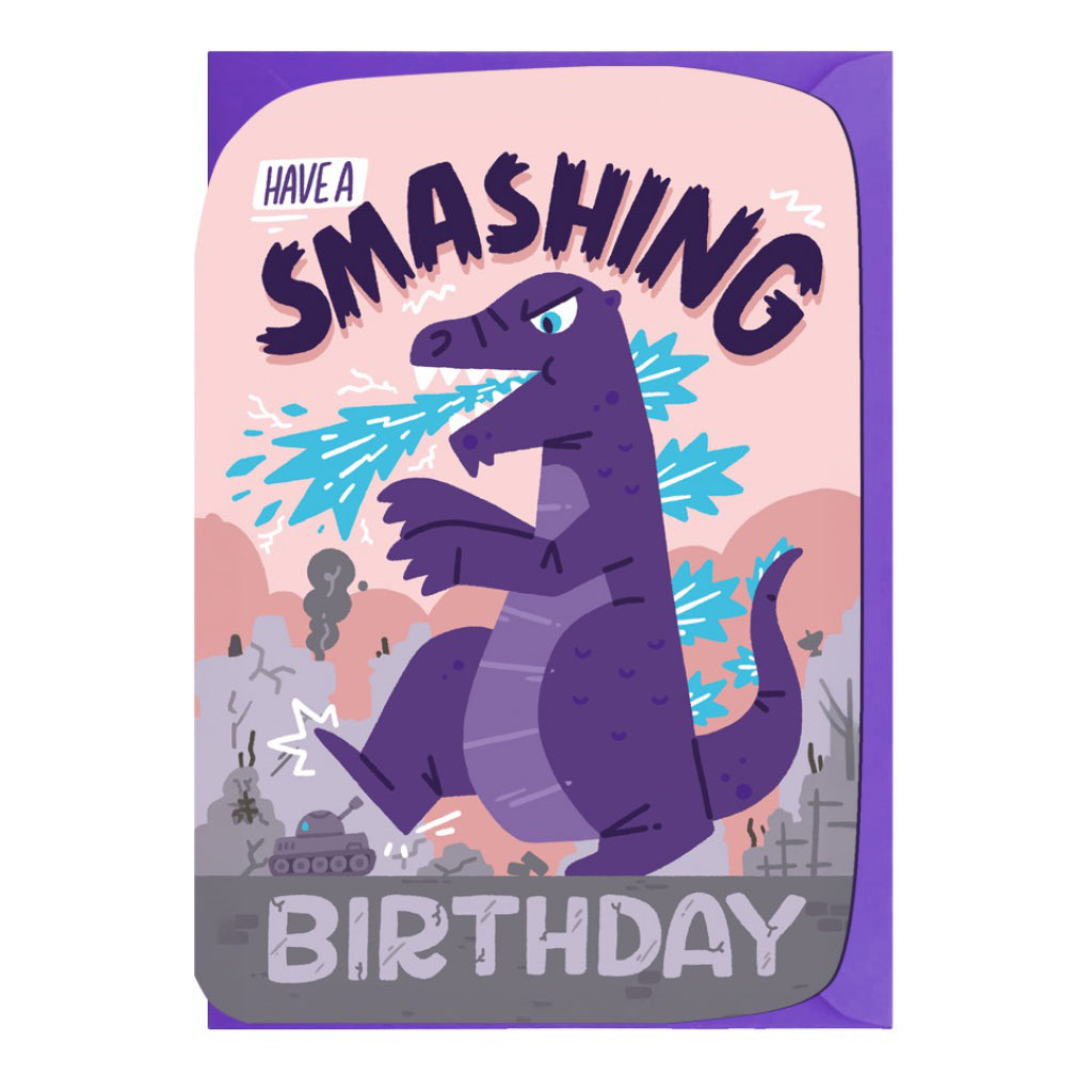Have a smashing birthday with this fierce and funny dinosaur card. Featuring a fire breathing monster and bold die cut shape, it is perfect for kids and dino fans alike.