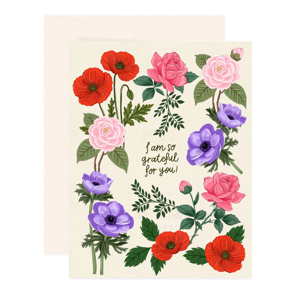 Share heartfelt appreciation with this illustrated so grateful for you card, surrounded by vibrant florals. Printed on thick card stock and blank inside for your personal note.