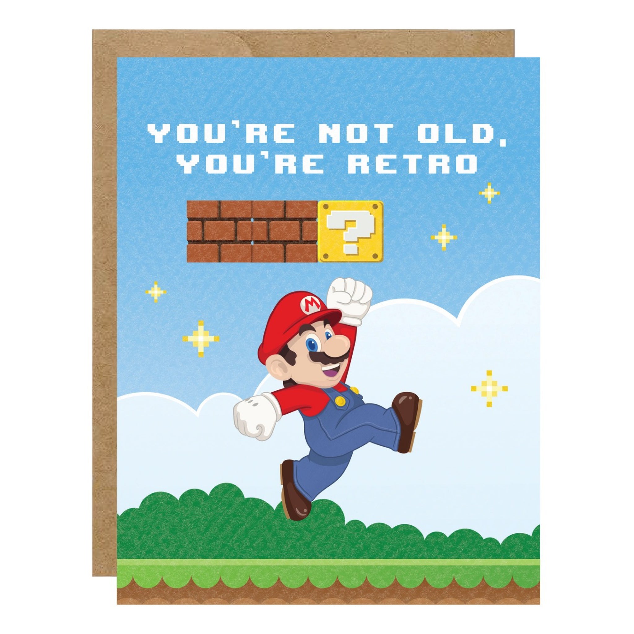 You’re not old, you’re retro. This video game inspired birthday card is blank inside, printed on white cardstock, and paired with a kraft envelope.
