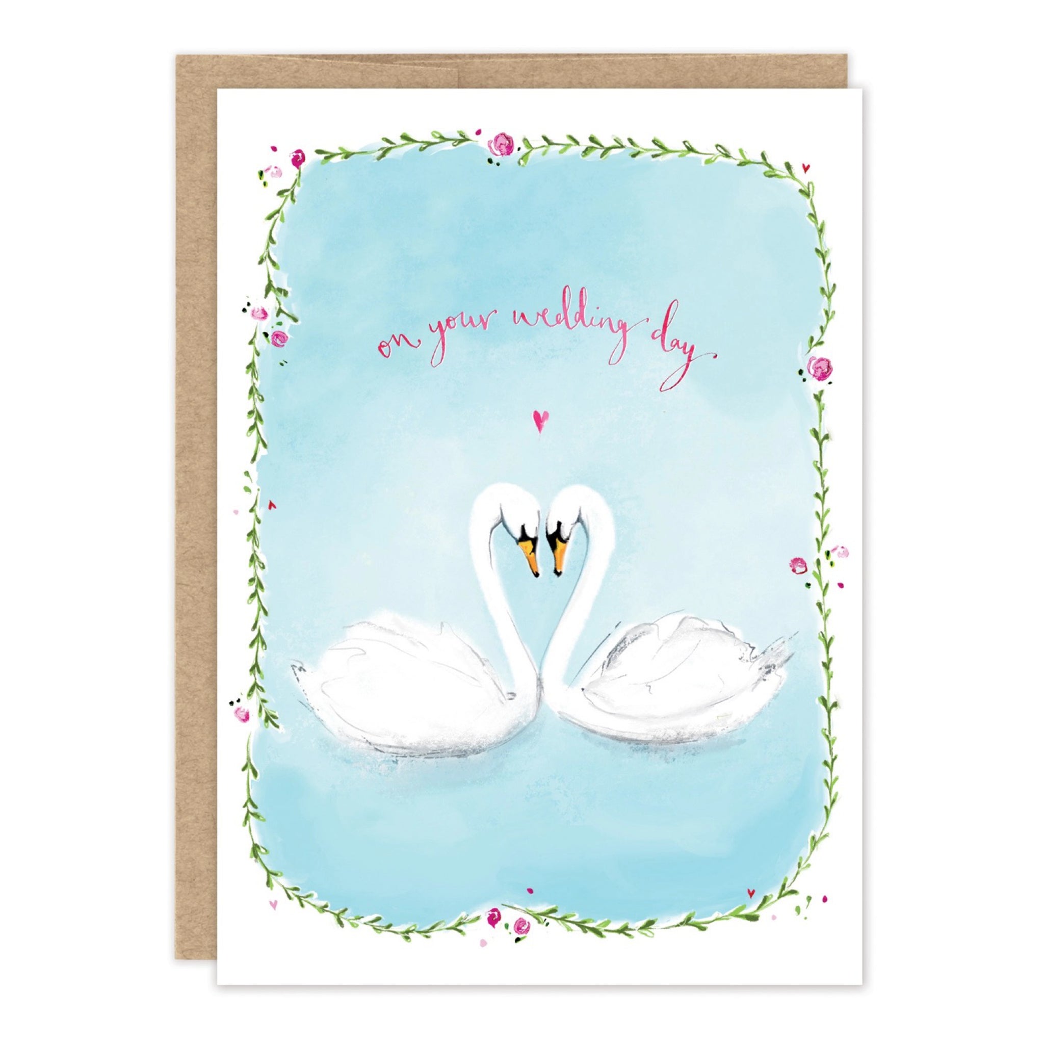 A romantic wedding card featuring two graceful swans forming a heart, framed by delicate florals and the message “on your wedding day.” A lovely way to celebrate love.