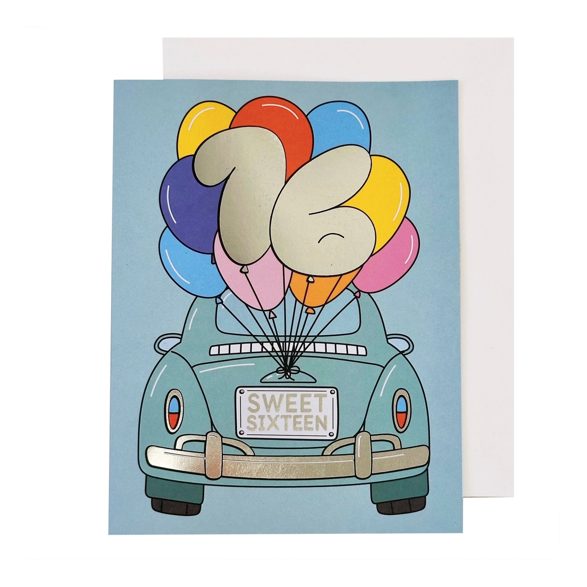 A fun sweet sixteen birthday card featuring a classic bug packed with balloons and a shiny silver hologram “Sweet Sixteen” greeting. Perfect for marking a milestone in style.