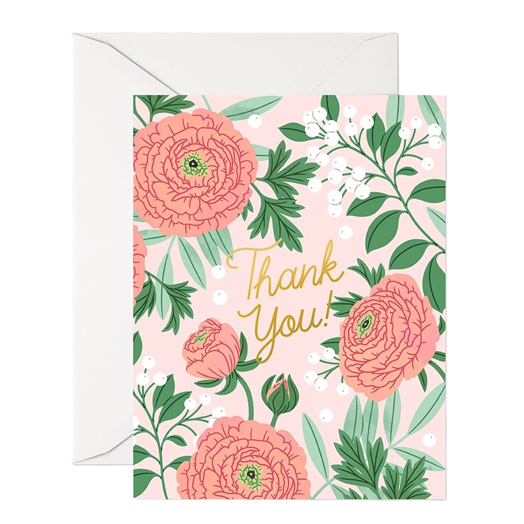 This thank you ranunculus greeting card features peach blooms and berries with gold foil lettering, perfect for gratitude that feels bright, warm, and heartfelt.