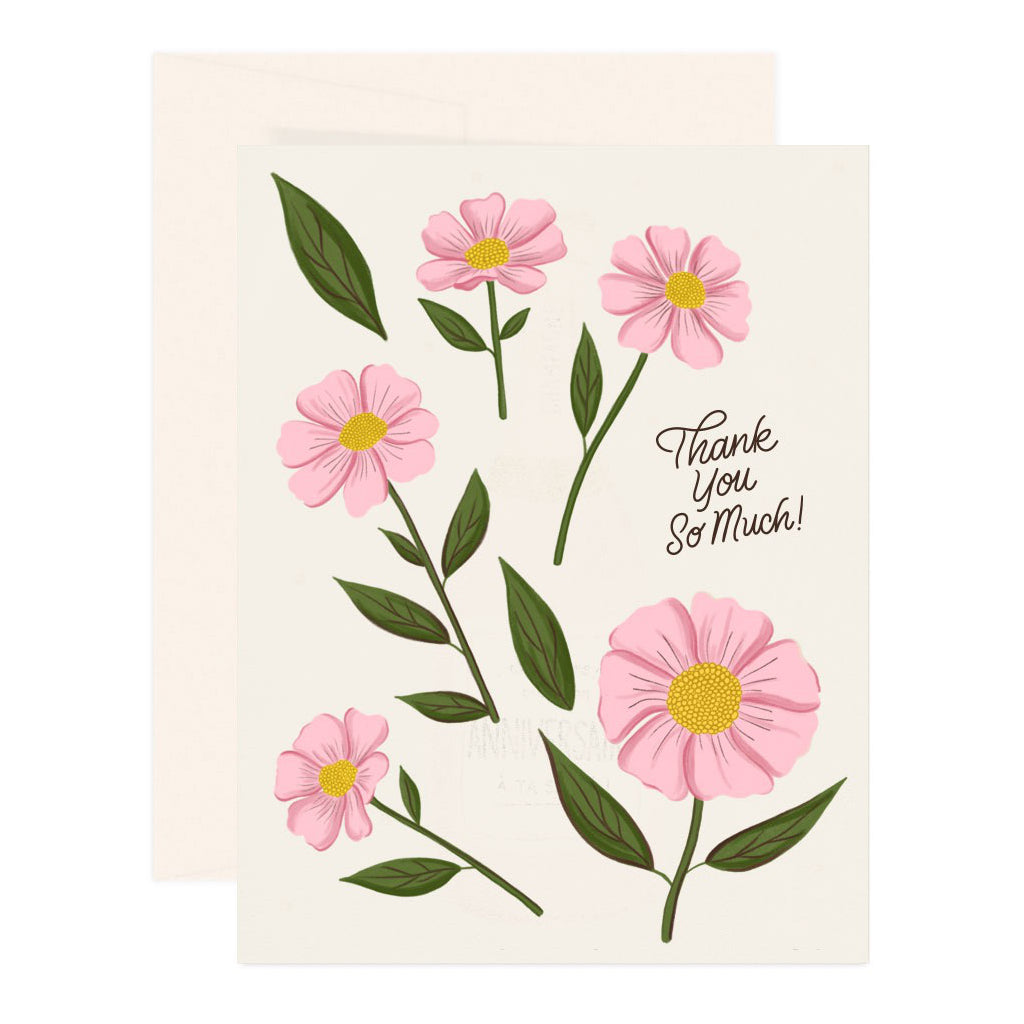 Say thank you so much with this sweet illustrated floral card featuring soft pink blooms. Printed on thick card stock and blank inside for your heartfelt note of appreciation.