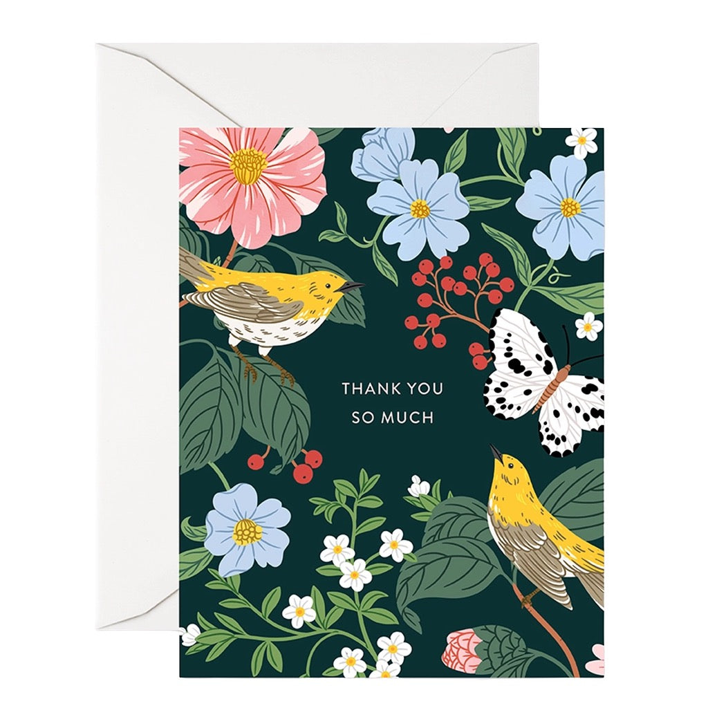 This thank you warblers greeting card features charming birds tucked into a lush garden of florals, perfect for sending a warm, thoughtful thanks.