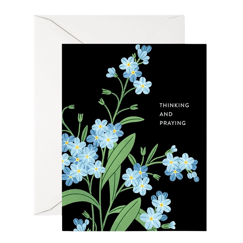 This thinking and praying greeting card features soft blue forget me not flowers on a dark background, offering a gentle way to share comfort and support.