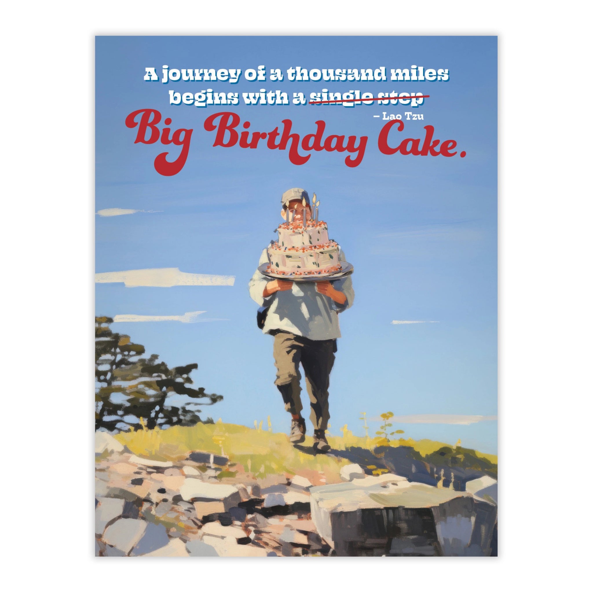 A playful birthday card featuring a hiker hauling an oversized cake, with the message “A journey of a thousand miles begins with a big birthday cake.” Blank inside for your note.
