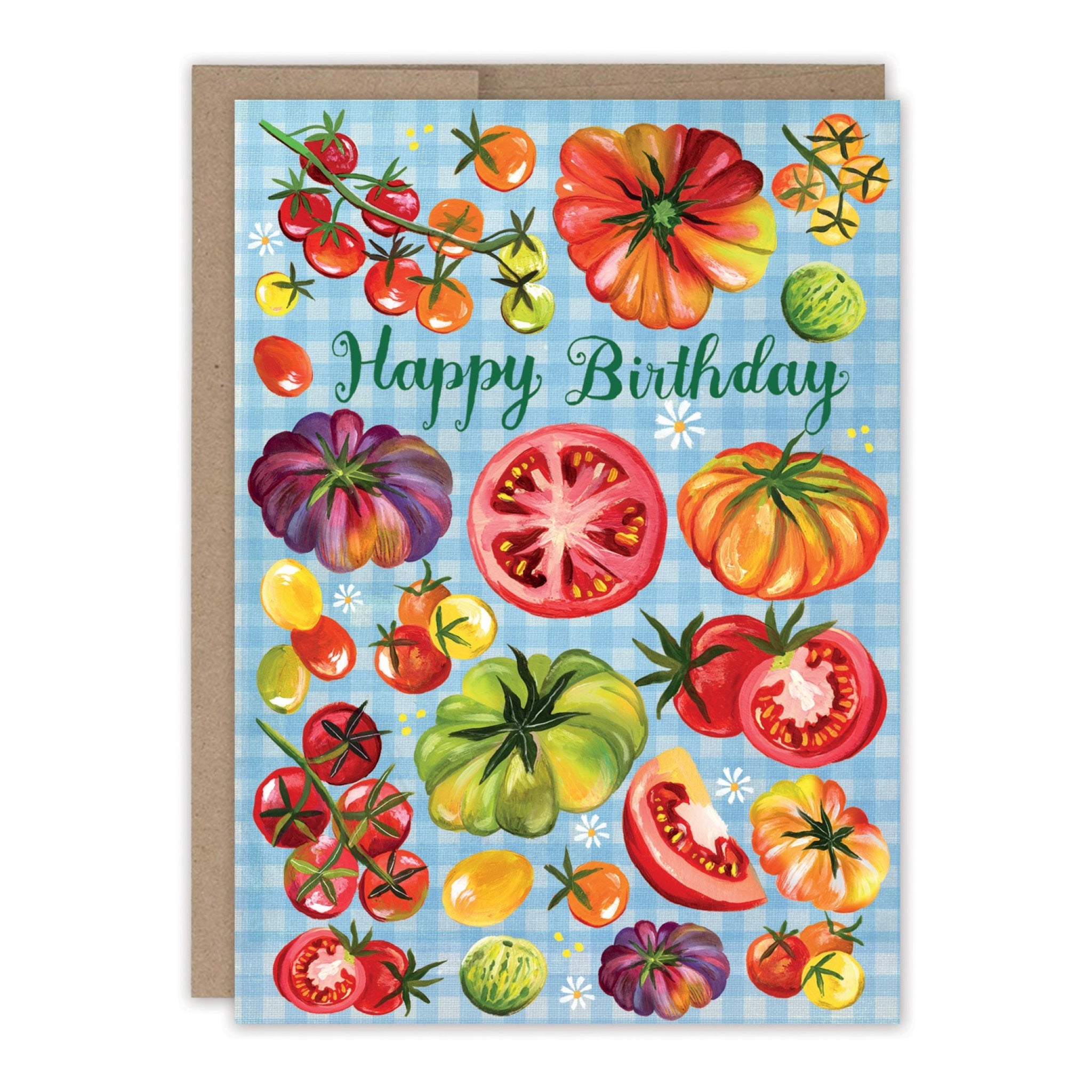 A cheerful birthday card bursting with colorful tomatoes and garden fresh charm. A playful way to send abundant wishes and celebrate another year.