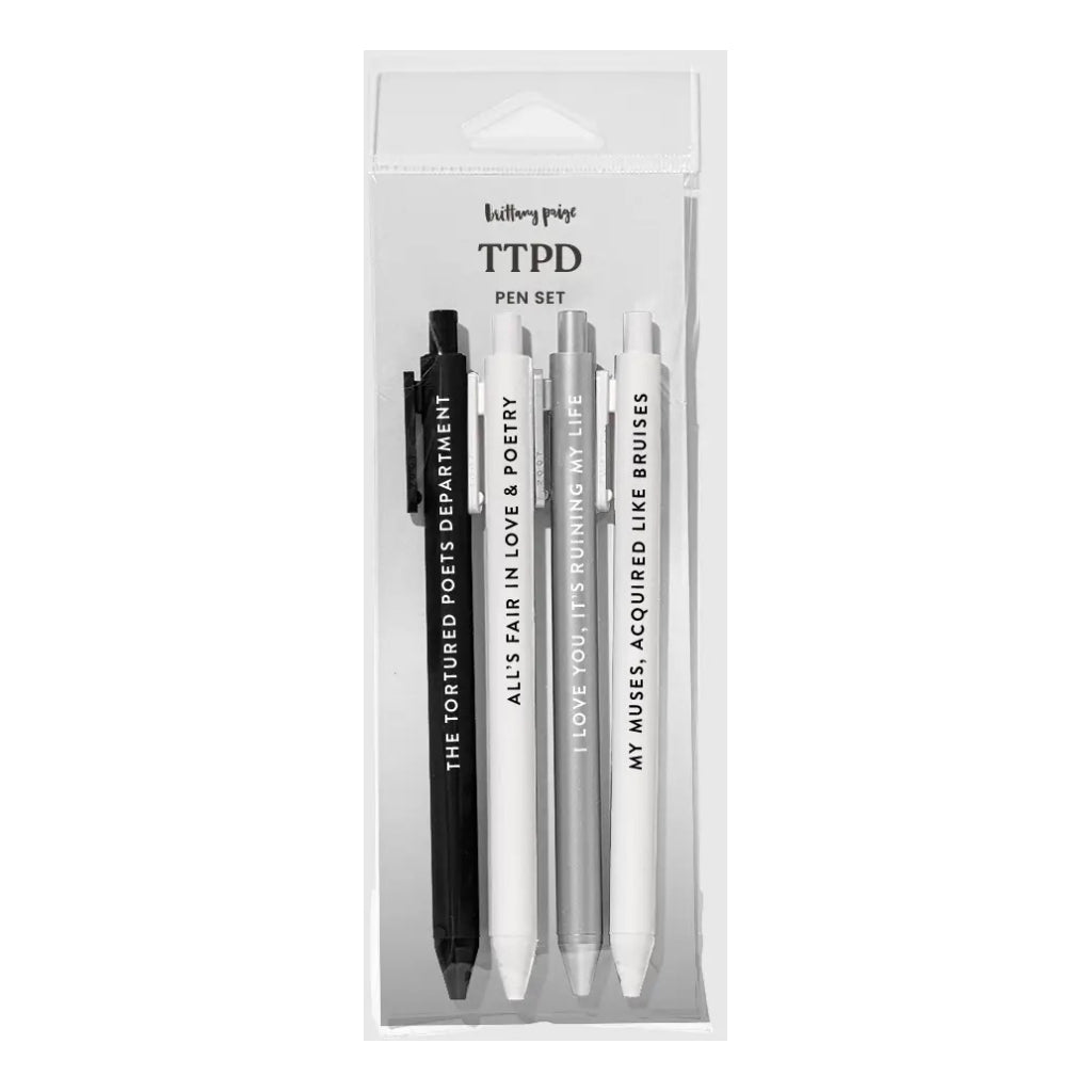 Pens Say: The Tortured Poets Department, All's Fair in Love & Poetry, I Love You, But It's Ruining My Life, My Muses, Acquired Like Bruises.