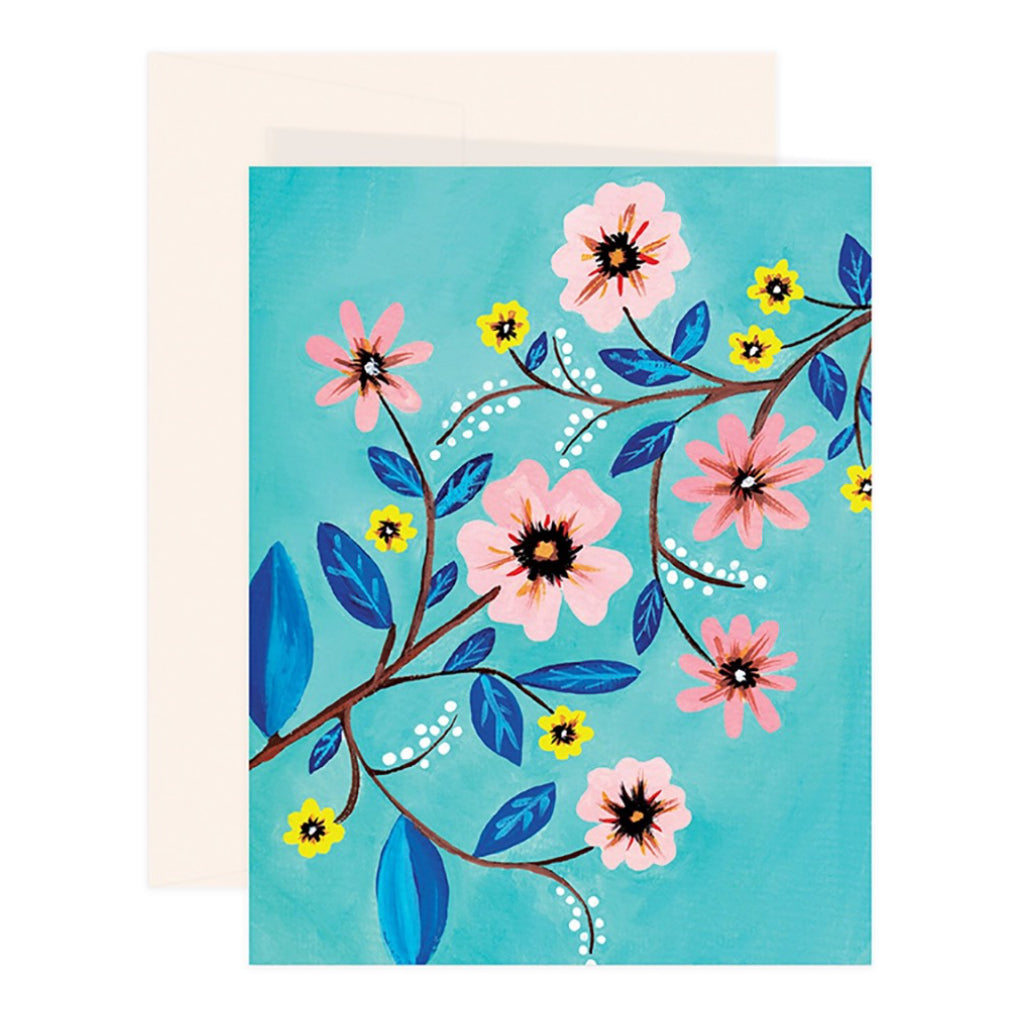 A vibrant floral card featuring pink and yellow blooms against a turquoise background, perfect for birthdays, thank you notes, or just because. Printed on thick card stock and blank inside for your message.