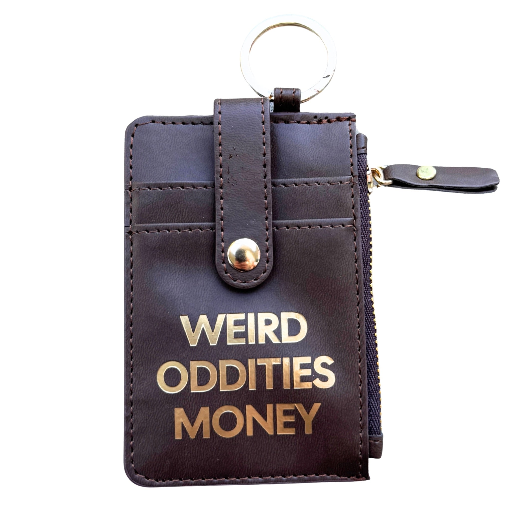 For cash reserved strictly for curiosities and impulse finds. This compact keychain wallet keeps cards, coins, and oddity funds organized in a sleek design with gold foil lettering.