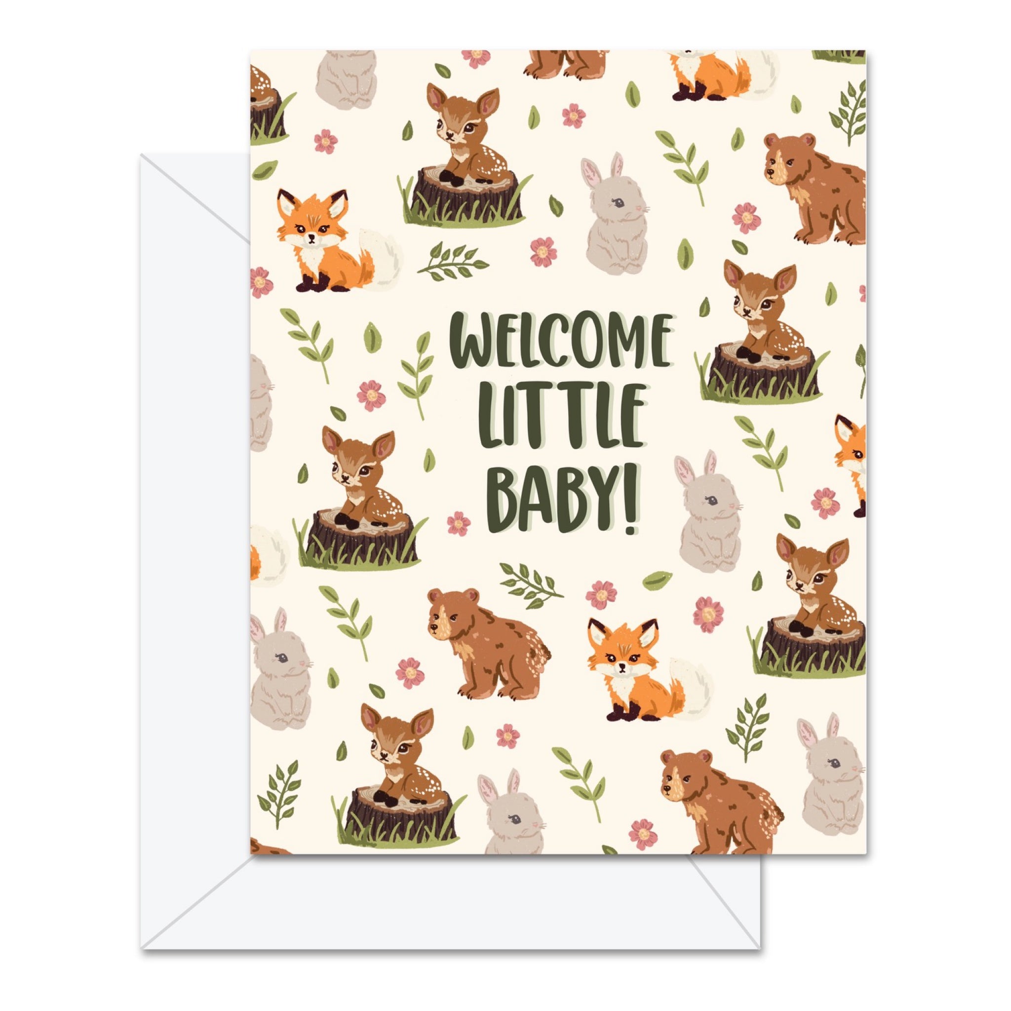 Welcome a new little one with woodland charm. This sweet baby card features adorable forest animals and the message “Welcome little baby!” Printed on smooth, bright white heavy cardstock and blank inside for your personal note.