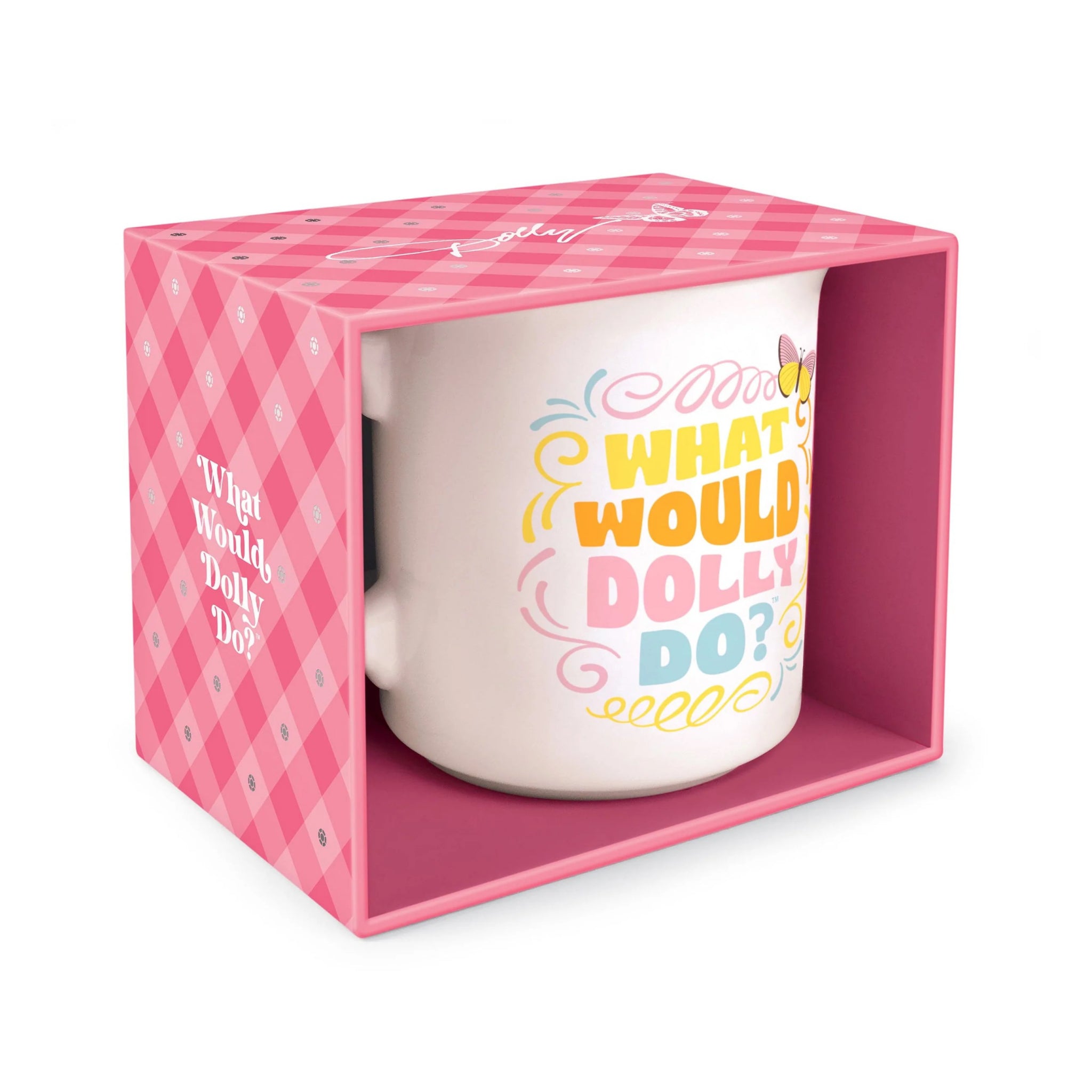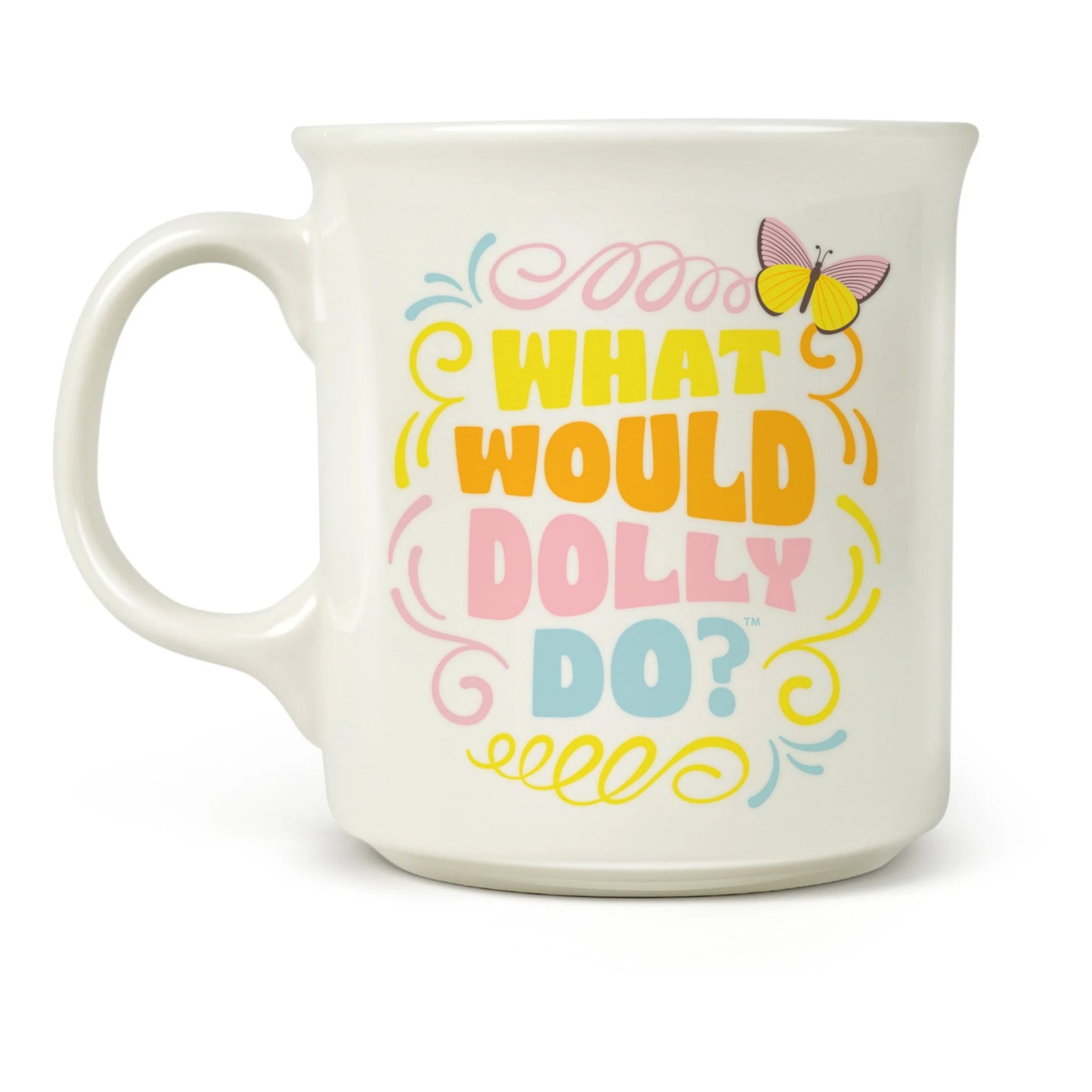 When in doubt, ask yourself WWDD? This oversized 16-ounce mug is ready for coffee, tea, or a little southern comfort. With its colorful “What Would Dolly Do?” message and a signature detail on the inner lip, it’s equal parts wisdom, wit, and daily caffeine support.