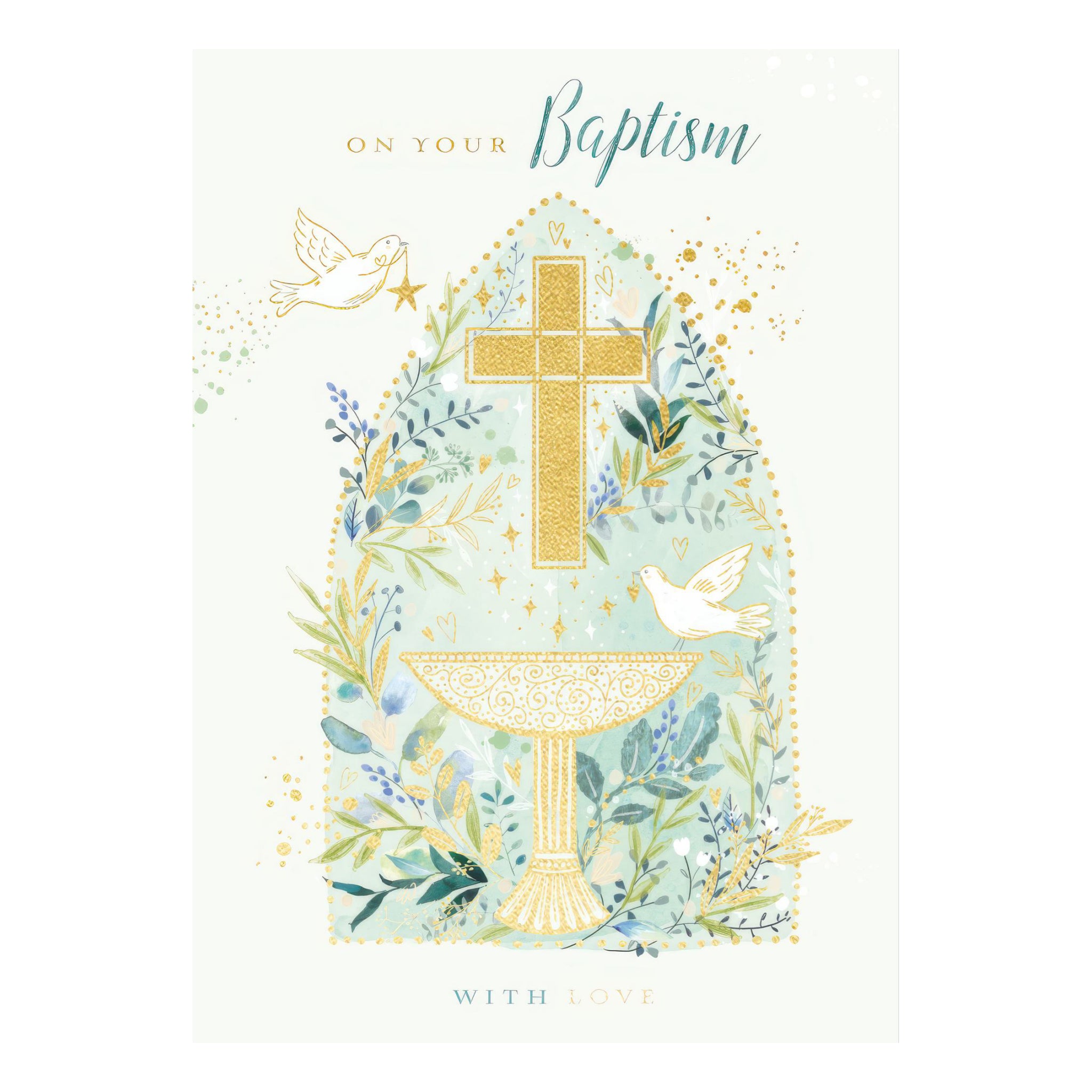 Send warm wishes for a baptism with this beautiful card featuring a delicate illustration and foil finish. Inside reads “Congratulations on your special day.”