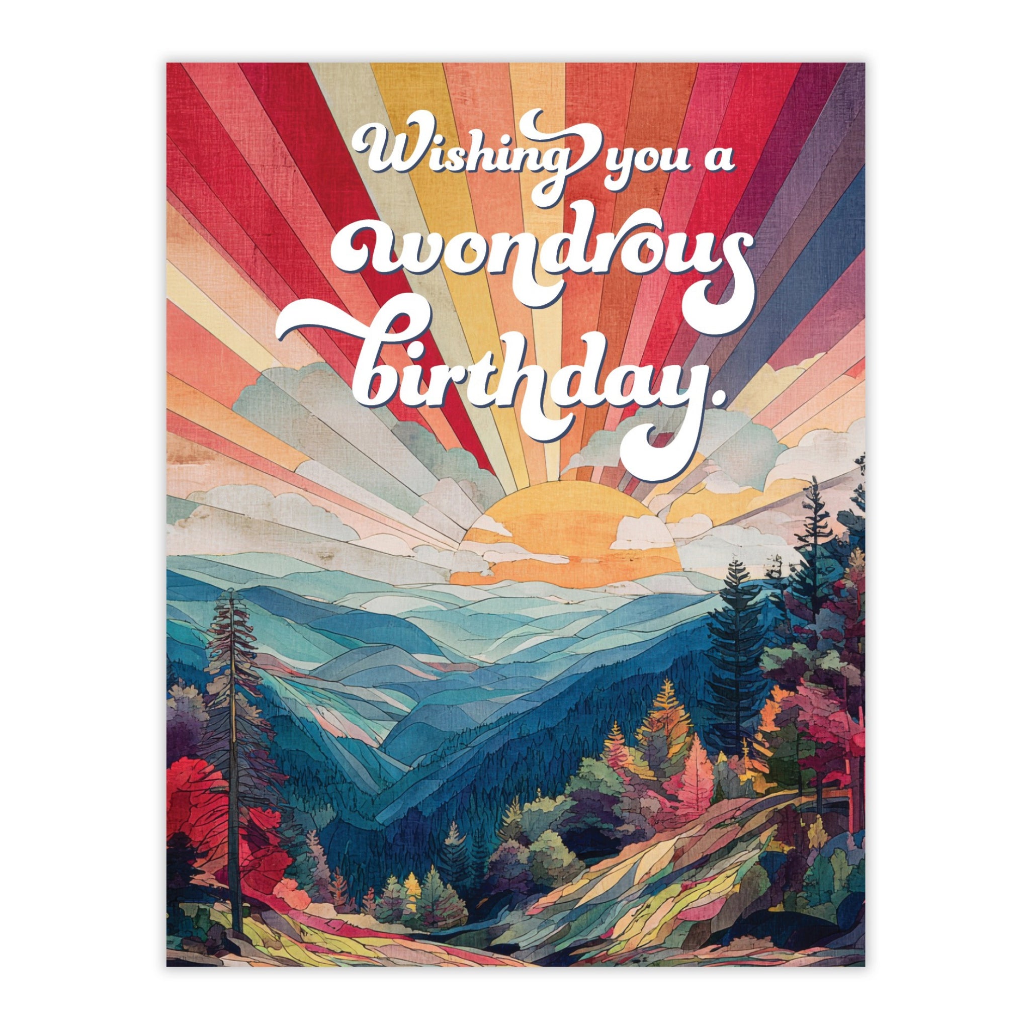 A vibrant birthday card featuring a colourful mountain landscape with sunlight rays and forest textures, finished with the message “Wishing you a wondrous birthday.” Blank inside for your note.