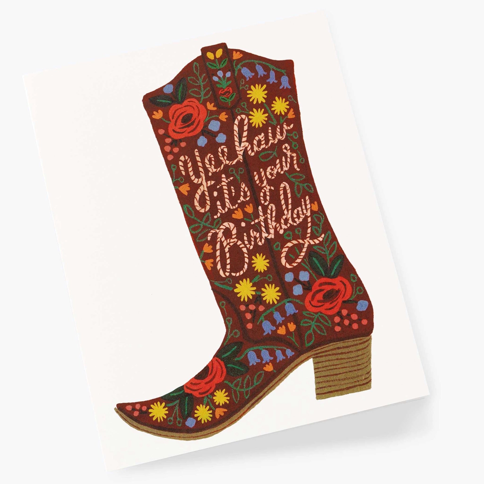 Send your favorite someone a thoughtful message with this Yeehaw birthday boot greeting card! A blank interior lets your handwritten note take center stage.