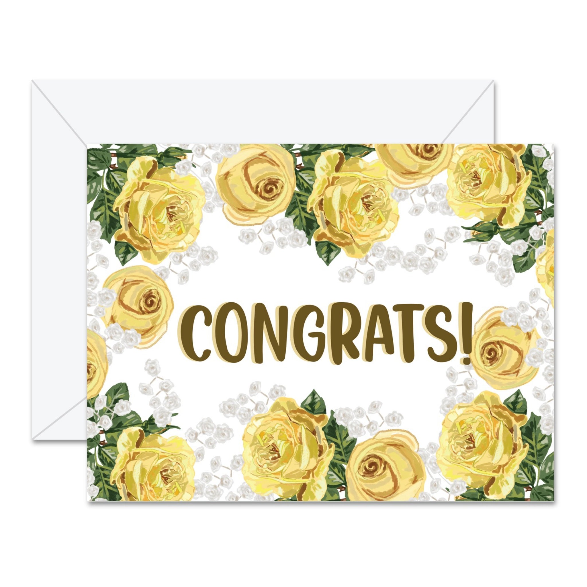 Send bright, floral congratulations with this yellow rose card featuring a cheerful “Congrats!” front. Professionally printed on smooth, bright white heavy cardstock and blank inside for your message, it is an easy go-to for graduations, new jobs, and big wins.