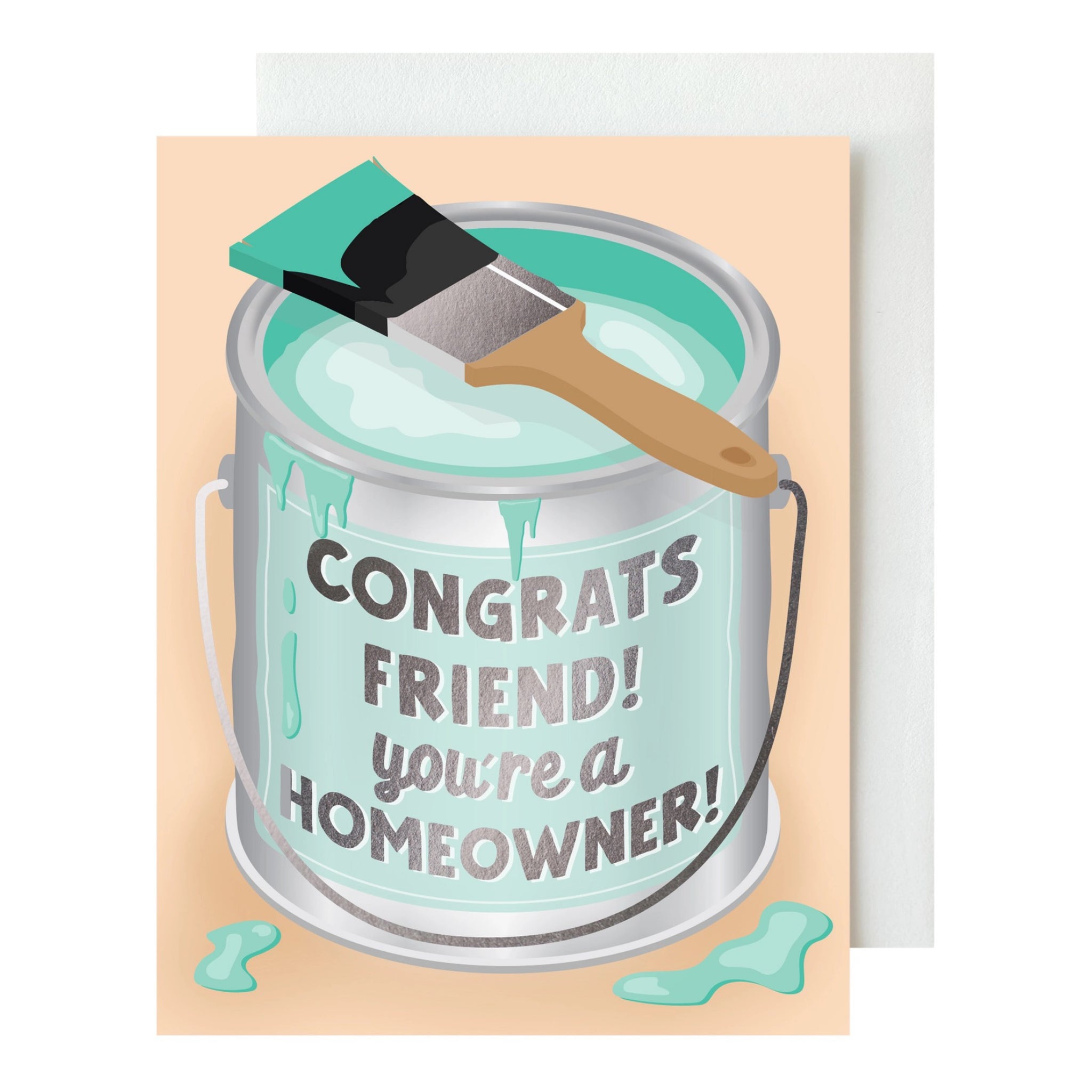 A fun housewarming card featuring a paint can illustration with silver foil shine, perfect for celebrating a new home and fresh start.